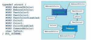 Składowe left, right, top i bottom nagłówka OBJ_HEADER określają współrzędne pozycji obiektu i rozmiar. Bardzo ważną składową struktury nagłówka jest struktura stylu GOL_SCHEME. Funkcja GOLCreate- Scheme() tworzy i inicjalizuje tę strukturę określającą styl obiektów graficznych tworzonych w warstwie Graphic Object Layer. Na rysunku 10 pokazano przykład znaczenia składowych struktury GOL_SCHEME dla obiektu przycisku Button.