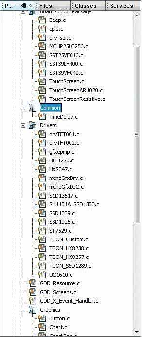 Zrzut ekranu głównego programu GDD-X po utworzeniu projektu został pokazany na rysunku 13. Po utworzeniu projektu w MPLAB-X nie są do niego dołączone żadne pliki źródłowe. Możemy je dołączyć ręcznie, tak jak to zostało opisane w pliku pomocy lub zrobi to za nas GDD-X po kliknięciu na ikonę Generate code (Project → Generate Code). Nawet gdy projekt GDD-X nie zawiera żadnych elementów graficznych poza zdefiniowanym ekranem głównym, to i tak po kliknięciu na Generate code otwarty projekt w MPLAB-X, w którym uruchomiono GDD-X, zostanie uzupełniony o wszystkie potrzebne pliki biblioteki graficznej (rysunek 14).