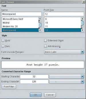 Osobnym problemem jest generowanie wzorca znaków dla funkcji wyświetla- nia napisów. Definiowanie różnych krojów i wielkości czcionek "na piechotę" jest zajęciem bardzo żmudnym. Istnieje narzędzie, które potrafi to zrobić za nas bardzo szybko. O nim również powiemy przy okazji omawiania warstwy obiektów.