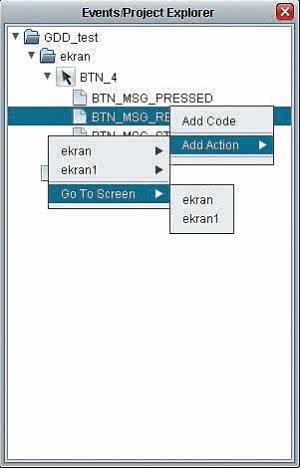 Na naszym ekranie "ekran" ustawiamy element Button i w oknie Properties zmieniamy w polu Text napis z Button na Ekran1. Następnie, klikamy na zakładkę Rysunek 20. Wybór akcji przypisanej do zdarzenia "+" w panelu Drawing Panel i dodajemy nowy ekran o nazwie "ekran1". Interfejs elementów graficznych Message Interface jest obsługiwany w okienku Events/Project Explorer. Są tam umieszczone nazwy ekranów i identyfikatory obiektów umieszczanych na poszczególnych ekranach, łączenie z możliwymi zdarzeniami (rysunek 19). Jak widać, są tu umieszczone identyfikatory dwóch ekranów (ekran i ekran1) oraz identyfikator BTN_4 przycisku Button. Dla przycisku są zdefiniowane cztery zdarzenia, zgodnie z tym, co powiedzieliśmy sobie przed chwilą. Jeżeli teraz klikniemy prawym przyciskiem myszki na opis zdarzenia, to możemy wybrać dwa działania: dodaj akcję (Add Action) i dodaj kod (Add Code).
