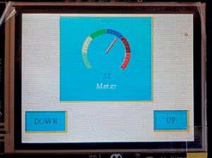 Na rysunku 22 pokazano ekran z opisywanym przykładem. Żeby wyświetlana wartość była dobrze widoczna, wybrałem w definicji stylu pogrubioną czcionkę Arial o wielkości 24, dla której są zdefiniowane wzorce znaków tylko dla cyfr 0...9. Teraz zmienimy obiekt Digital Meter na analogowo/cyfrowy miernik Meter - rysunek 23. Ten obiekt pokazuje wartość w postaci analogowej (wskazówka na skali) oraz w postaci cyfrowej u dołu skali. W zakładce Properties → General ustawiamy parametr Minval=1 i Maxval=50. Wyświetlane wartości będą się mogły zmieniać w zakresie 1...50 z krokiem co 1. Na listingu 16 pokazano fragment programu obsługującego zmianę wyświetlanej wartości przyciskami UP i DOWN.