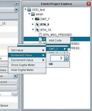 Modyfikacja wyświetlanej wartości odbywa się z wykorzystaniem funkcji i makr przypisanych do obiektu Digital Meter. Funkcja DmSetValue ustawia warto wyświetlanej zmiennej. Jej argumentami są: wskaźnik do modyfikowanego obiektu i nowa wartość. Uzupełnieniem tej funkcji są dwa makra wykonujące inkrementacje i dekrementację wyświetlanej wartości o określoną w argumencie wartość. Zdefiniujmy dodatkowe dwa przyciski i nazwijmy je UP i DOWN. Za pomocą GDD-X można napisać program, który będzie modyfikował i wyświetlał wartość w postaci cyfrowej. W oknie Events/Projects Explorer klikamy na identyfikator DMT_7 i wykonujemy Add Code. Powoduje to uaktywnienie obiektu. Teraz dla przycisku nazwanego UP definiujemy akcję inkrementacji wyświetlanej wartości o 1 przy każdym przyciśnięciu i zwolnieniu. Klikamy prawym przyciskiem myszy na BTN_10->BTN_MSG_RELEASED, wybieramy Add Action. Potem wybieramy element Digital Meter DMT_7 z ekranu "ekran", a następnie akcję Increment Value i na koniec wartość inkrementacji (tutaj o 1). Zostało to pokazane na rysunku 21. Podobne czynności wykonujemy dla przycisku BTN_9 z tym, że tam definiujemy dekrementację wartości o 1. Po tych definicjach GDD X wygeneruje kod obsługi pokazany na listingu 15.