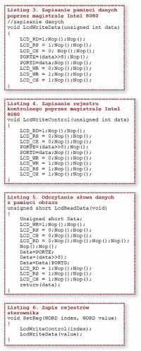 Magistrala Intel 8080 składa się z linii danych i linii sterujących (opcjonalnie z linii adresowych). Linie sterujące to !WR (zapis) i !RD (odczyt). Cykl zapisu danych rozpoczyna się od wyzerowania linii !WR, a następnie wystawienia ważnych danych na magistrali. Narastające zbocze sygnału !WR zapisuje dane do rejestru sterownika. Interfejs sterujący jest uzupełniony o 2 dodatkowe linie: wyboru interfejsu CS i źródła zapisywanych danych D/!C ( w opisie wyprowadzeń wyświetlacza ta linia nazywa się RS). Jeżeli linia D/!C jest ustawiona, to jest zapisywana pamięć danych, jeżeli wyzerowana, to jest zapisywany rejestr (adres rejestru). Na rysunku 3 pokazano przebiegi czasowe w czasie zapisu danych. Na listingu 3 pokazano procedurę zapisu danej (zaadresowanej komórki pamięci obrazu), a na listingu 4 zapisu rejestru sterownika.