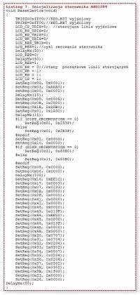 Każdy sterownik wyświetlacza graficznego wymaga inicjalizacji polegającej na zapisaniu rejestrów konfiguracyjnych. W sterowniku SSD1289 zapisywanie rejestrów polega na wykonaniu cyklu zapisu adresu, a po nim cyklu zapisu 16-bitowej danej (listing 6). Kompletny cykl przykładowej inicjalizacji pokazano na listingu 7.