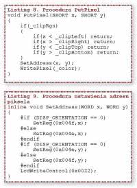 W dokumentacji biblioteki, w części poświęconej dodawaniu nowego sterownika jest opisany zestaw funkcji warstwy Device Driver Layer niezbędnych dla prawidłowego działania wyświetlacza. Ponieważ SSD1289 jest wspierany przez bibliotekę, to teoretycznie wszystkie funkcje powinny być gotowe. W praktyce jednak konieczne były zmiany w kilku kluczowych procedurach. Jedną z najważniejszych procedur w tej warstwie jest z „zapalenie” jednego piksela matrycy – PutPixel. Każdy piksel ma dwa podstawowe atrybuty: adres (wyznaczany na postawie współrzędnych x, y) oraz kolor. Standardowa procedura PutPixel ma dwa argumenty: współrzędną x i współrzędną y ( listing 8). Kolor piksela jest zawarty w zmiennej globalnej _color. Przed ustaleniem adresu i zapisaniem danej sprawdzane jest czy współrzędne x i y nie mają wartości spoza dopuszczalnego zakresu określonego przez wielkość matrycy. Procedurę SetAdress pokazano na listingu 9. Zależnie od przyjętej orientacji (pionowa lub pozioma) współrzędne są zapisywane zamiennie komendami o adresie 0x4e, lub 0x4f. Procedurę kończy wysłanie komendy 0x22 (Write data to GRAM). Funkcja Write-Piksel to makro:
