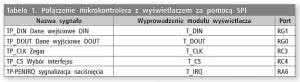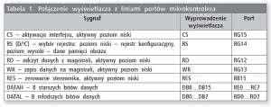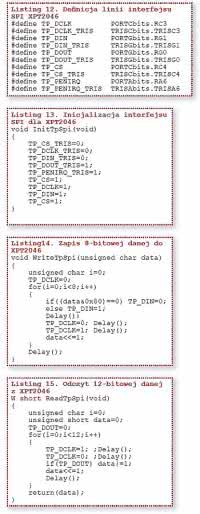 Z punktu widzenia XPT2046, magistrala SPI składa się z następujących linii: danych wyjściowych DOUT, danych wejściowych DIN, zegara taktującego DCLK oraz linii wyboru interfejsu CS. Interfejs komunikacyjny jest uzupełniony o linię sygnalizacyjną PENIRQ. Na listingu 12 pokazano definicję linii portów, a w tabeli 1 zamieszczono sposób połączenia mikrokontrolera z wyświetlaczem.