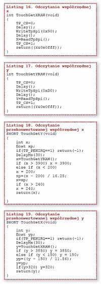 Do odczytania współrzędnych są używane dwie funkcje: TouchGetXRAW() – listing 16 i TouchGetYRAW – listing 17. Obie podają zmierzone wartości rezystancji w rozdzielczości 12 bitowej, a więc ich wartości zmieniają się w zakresie 0...4095. Żeby uzyskać rzeczywiste współrzędne z zakresu 0