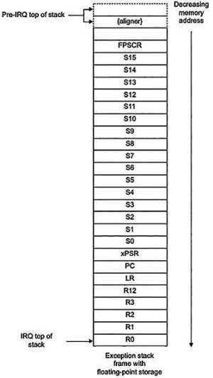Jeśli bieżący kontekst nie zawiera operacji zmiennoprzecinkowych, ramka ta jest identyczna, jak w przypadku rdzenia M3 i wygląda jak na rysunku 2. Gdy kontekst zawiera operacje zmiennoprzecinkowe ramka zawiera dodatkowo automatycznie zapisane młodsze 16 rejestrów koprocesora S0-S15, co pokazano na rysunku 3, natomiast pozostałe rejestry S16-S31 powinny zostać zapisane przez kompilator w razie potrzeby za pomocą instrukcji vpush a następnie przywrócone za pomocą instrukcji vpop.