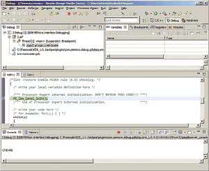 Po częściowym lub całkowitym ukończeniu pracy nad pisaniem kodu źródłowego programista może uruchomić aplikację na platformie sprzętowej w celu przeanalizowania poprawności jej działania. Do tego celu służy trzecia perspektywa - Debug (rysunek 5). Udostępnia ona następujące okna: