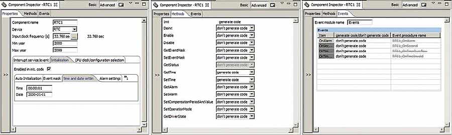 Trzecia zakładka Events również udostępnia listę funkcji dla danego peryferium. Funkcje te to tak zwane zdarzenia (funkcje, które zostaną wykonane, jeśli określony warunek zostanie spełniony). Jako przykład dostępne funkcje tego typu dla peryferium RTC przedstawiono na rysunku 8c. Analogicznie do zakładki Methods, programista w zakładce Events wybiera które z funkcji-zdarzeń zostaną włączone do plików projektu.