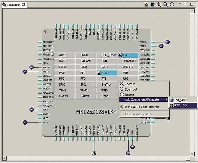 W pierwszej kolejności programista wybiera z których peryferiów mikrokontrolera chce korzystać i jakie komponenty oprogramowania będą przeznaczone do ich sterowania. Wskazanie pojedynczego poryferium i dedykowanego mu komponentu oprogramowania odbywa się przez najechanie kursorem myszy na symbol wybranego peryferium w oknie Processor, wywołanie menu kontekstowego przez naciśnięcie prawego przycisku myszy, wybranie z tego menu opcji Add Component/ Template, a następnie wybranie z listy jednego z dostępnych komponentów. Przykład wybrania komponentu oprogramowania odpowiadającego peryferium mikrokontrolera o nazwie RTC przedstawiono na rysunku 8.