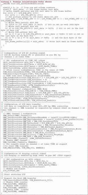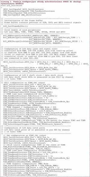 Kod źródłowy funkcji LCD_Init() konfigurującej układy peryferyjne mikrokontrolera STM32F107 do pracy jako sterownik wyświetlacza EG2801S zamieszczono na listingu 1. Programowanie poszczególnych układów nie różni się w sposób znaczący od konfiguracji peryferii mikrokontrolera STM32, szczegółowo opisanej przy okazji omawiania konstrukcji sterownika dla wyświetlacza EG9018C.