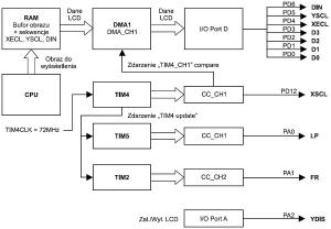 Sterownik wyświetlacza EG2801S jest zbudowany z trzech układów czasowo-licznikowych TIM4, TIM5 i TIM2 oraz układu DMA1. Timer TIM4 pracuje jako generator sygnału zegara danych XSCL. Układ ten jest taktowany niepodzielonym sygnałem zegarowym magistrali APB1 i odmierza okres sygnału XSCL. Kanał CH1 tego timera pracuje w trybie PWM generując na swoim wyjściu przebieg prostokątny o wypełnieniu 50%, którego opadające zbocze występuje w połowie okresu zliczania TIM4. Sygnał ten jest doprowadzony do modułu LCD jako zegar danych XSCL.