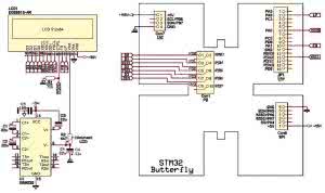 Model sterownika został wykonany na bazie zestawu uruchomieniowego STM32 Butterfly, wyposażonego w mikrokontroler STM32F107 (fotografia 4). Schemat połączeń modułu wyświetlacza EG2801S z płytką STM32 Butterfly pokazano na rysunku 5. Wyświetlacz LCD jest bezpośrednio dołączony do portów mikrokontrolera. Co prawda, moduł EG2801S jest przeznaczony do sterowania sygnałami logicznymi w standardzie 5V, jednak jak wykazały próby z egzemplarzem wyświetlacza typu EG2801S-AR oraz typu ECM-A0083, sterowanie tych modułów sygnałami o poziomie +3,3V działa poprawnie.