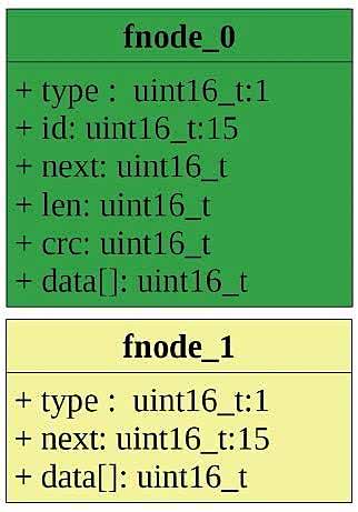 Rysunek 3. Jednostka alokacji może przechowywać jeden z dwóch rodzajów danych, nagłówek oznaczony fnode_0 oraz dane wraz ze wskaźnikiem następnej jednostki alokacji oznaczonym fnode_1