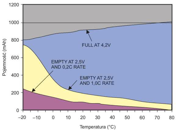 Na rysunku 2 pokazano zależności parametrów ogniw litowo-jonowych od temperatury. Górna krzywa pokazuje pojemność naładowanego akumulatora w różnych temperaturach. Akumulator może wytrzymać około 20% więcej ładunku w wyższej temperaturze niż w temperaturze –20°C i mniej. Dolne krzywe pokazują, że temperatura ma istotny wpływ na dostępny ładunek podczas rozładowywania. Wykres pokazuje również, że w pełni naładowany akumulator rozładowany dwoma różnymi prądami (0,2 C i 1,0 C, gdzie C to wartość prądu, który rozładuje ogniwo w jedną godzinę – na przykład dla ogniwa 120 mAh, prąd C=120 mA), aż do poziomu 2,5 V, wykazuje odmienne zachowanie.