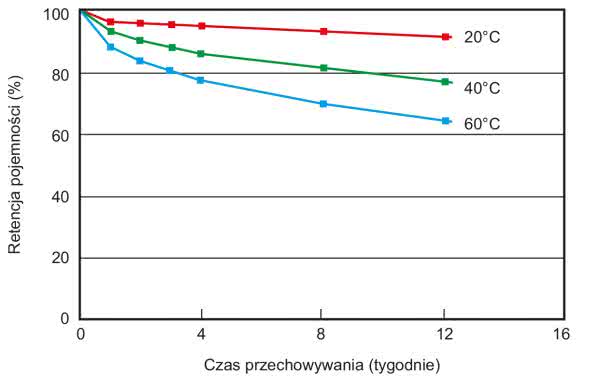 Baterie litowe podlegają również starzeniu związanemu z czasem, niezależnie od ilości cyklów pracy akumulatora. Powoduje to, że ich pojemność spada cały czas od momentu opuszczenia fabryki przez akumulator, niezależnie od jego użytkowania. Efekt ten może spowodować, że w pełni naładowany akumulator litowo-jonowy straci nawet do 20% pojemności rocznie, przy przechowywaniu go w temperaturze 25°C i 35% w temperaturze 40°C [2]. W przypadku częściowo naładowanych akumulatorów proces starzenia następuje wolniej: w przypadku akumulatora naładowanego do około 40% ładunkiem resztkowym, strata pojemności wynosi około 4% jego początkowej pojemności na rok, przy magazynowaniu ogniwa w warunkach normalnych. Wraz ze wzrostem temperatury, prędkość spadku pojemności ogniwa wzrasta [7].