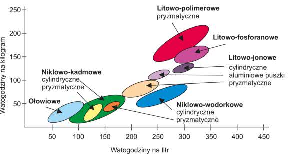 Akumulatory litowo-jonowe są produkowane masowo dopiero od około 1997 roku, po rozwiązaniu różnych problemów technicznych podczas ich opracowywania. Ponieważ oferują najwyższą gęstość energii pod względem objętości i masy (rysunek 1), są stosowane w różnych systemach, od telefonów komórkowych po samochody elektryczne.
