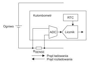 Przykładowy scalony kulombometr, który bazuje na układzie LTC4150 do pomiaru ładunku płynącego do i z baterii, pokazano na rysunku 7. Ładunek jest całką prądu w czasie. LTC4150 mierzy prąd akumulatora, monitorując spadek napięcia na rezystorze pomiarowym – boczniku o niewielkiej rezystancji RSENSE, a następnie całkuje ten pomiar w celu wyznaczenia ładunku. Rysunek 8 pokazuje schemat blokowy tego układu. Mierzony prąd jest filtrowany przez kondensator CF podłączony między pinami CF+ oraz CF– układu. Uśrednia wszystkie szybkie zmiany prądu wynikające z tętnień, szumu czy skoków obciążenia, a także prąd dostarczany w trybie impulsowym czy PWM. Sygnał z wyjścia filtra podawany jest na układ całkujący zestawiony ze wzmacniacza i kondensatora 100 pF w pętli sprzężenia zwrotnego.
