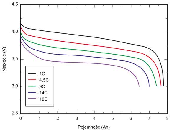 Zachowanie ogniwa zależy nie tylko od temperatury, ale także prądu rozładowywania. Przy danej temperaturze i szybkości rozładowania, pojemność ogniwa litowego wynika z różnicy między górną i dolną krzywą na rysunku 2. Tak więc, pojemność ogniw litowych jest znacznie mniejsza w niskich temperaturach lub przy dużym prądzie rozładowania (lub przez oba te czynniki naraz).
