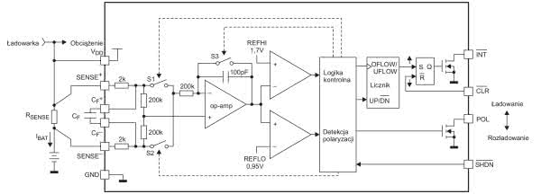 Przełączniki cyfrowe S1 i S2 w układzie służą do zmiany kierunku narastania/opadania sygnału na wyjściu filtra po osiągnięciu przez sygnał wyjściowy z układu całkującego poziomów REFHI lub REFLO. Na podstawie ich ustawienia i kierunku narastania układ wnioskuje o polaryzacji prądu płynącego przez RSENSE – kierunku przepływu ładunku przez opornik. Klucz S3 służy do resetowania układu całkującego.