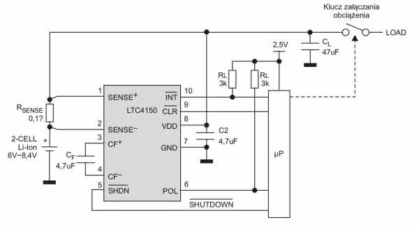 Przykładową implementację LT4150 w systemie z mikrokontrolerem pokazano na rysunku 7. W zaprezentowanym systemie układ monitoruje prąd ładowania/rozładowania ogniwa litowo-jonowymi z dwóch ogniw i pojemności nominalnej 850 mAh. Maksymalny prąd płynący z lub do akumulatora wynieść ma 500 mA. Dla układu LTC4150 |VSENSE|=50 mV, co pozwala dobrać opornik pomiarowy RSENSE=0,1 V. Parametr GVF=32,55 Hz/V, co pozwala, korzystając z równania 4, wyliczyć, że jeden impuls w takim układzie odpowiadać będzie 0,085 mAh. W pełni naładowane, idealne ogniwo o pojemności 850 mAh to 10 tysięcy impulsów na wyjściu INT tego układu [9].