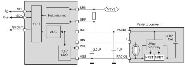 Przykładem kompletnego systemu do pomiaru poziomu naładowania ogniwa litowo-jonowego jest układ scalony BQ27426 firmy Texas Instrument. Przykładową aplikację pokazuje rysunek 9. Układ wymaga minimalnej ilości elementów zewnętrznych do działania – kluczowy jest jedynie bocznik do pomiaru prądu w postaci opornika o niskiej wartości rezystancji, która może wynosić nawet 10 mV [11]. Oprócz ładunku płynącego do i z ogniwa, system monitoruje także napięcie i temperaturę, wykorzystując termistor wbudowany w pakiet z ogniwem.