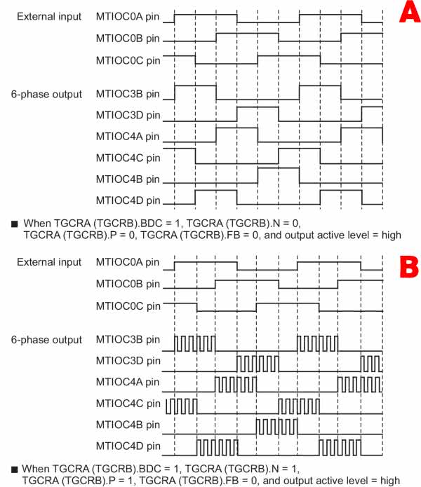 W trapezowym, najprostszym rodzaju sterowania drivery dostarczające napięcia zasilającego fazy silnika są sterowane w sposób pokazany na rysunku 7 w pierwszej części cyklu artykułów. Moment przełączania faz jest określany przez czujniki Halla umieszczone na wale wirnika lub przez algorytmy wykrywania położenia w układach bezczujnikowych. Jedna z konfiguracji kanałów licznikowych MTU3d (tryb Complementary Mode) umożliwia całkowicie sprzętowe sterowanie komutacją zasilania faz na podstawie sygnałów z czujników Halla. Na trzy wydzielone wejścia mikrokontrolera podawane są sygnały z czujników Halla, a na 6 wyjściach są „gotowe” sygnały sterujące tranzystorami drivera. Na rysunku 16 pokazano 2 konfiguracje pracy MTU3d w trybie Complementary Mode wykorzystującym kanały MTU3 i MTU4.