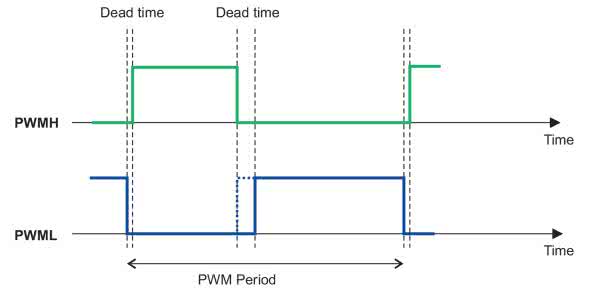 Jednym z typowych problemów sterowania komplementarnymi sygnałami PWM driverami silnika z wykorzystaniem układów mostkowych z tranzystorami MOS jest możliwość krótkotrwałego wprowadzenia w przewodzenie obu tranzystorów zasilania fazy. Pojemności pasożytnicze w układach bramek powodują, że przy szybkich przełączeniach jeden tranzystor jest jeszcze załączony, mimo że sygnał bramki go wyłącza, a drugi tranzystor jest już włączony. W wyniku powstaje krótkotrwałe zwarcie źródła zasilania przez oba tranzystory. Może tak się zdarzyć na przykład przy sterowaniu pokazanym na rysunku 16. Żeby tego uniknąć, w układach PWM wprowadza się pojęcie czasu martwego (dead time). Układy licznikowe generujące komplementarne przebiegi PWM często mają możliwość programowania czasu martwego zależnie od częstotliwości przełączania i użytych tranzystorów.