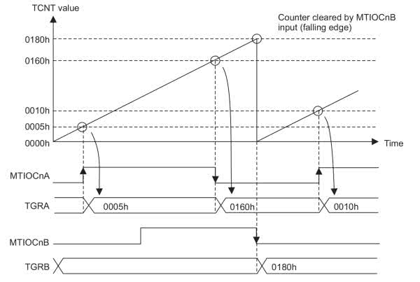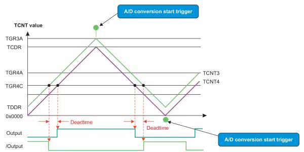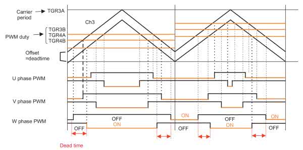 Na rysunku 17 pokazano przebieg PWM z czasami dead time, a na rysunku 18 sposób generowania trzech przebiegów komplementarnych z czasami dead time do sterowania trzema fazami silnika BLDC z wykorzystaniem dwu kanałów modułu MTU3d. Wartość współczynnika wypełnienia dla kolejnych faz określają wartości wpisane do rejestrów TGR3B, TGR4A i TGR4B.