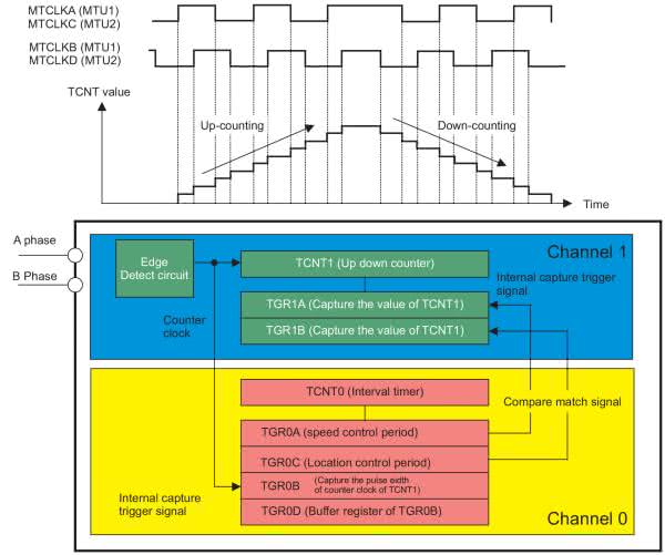 Do określania prędkości obrotowej i kierunku wirowania wirnika mogą być wykorzystywane enkodery. Moduły MTU1 i MTU2 mogą niezależnie pracować jako 16-bitowe liczniki zliczające różnicę faz pomiędzy dwoma zewnętrznymi sygnałami zegarowymi podawanymi na wejścia mikrokontrolera. MTU1 i MTU2 można połączyć kaskadowo i powstanie wtedy jeden 32-bitowy licznik.