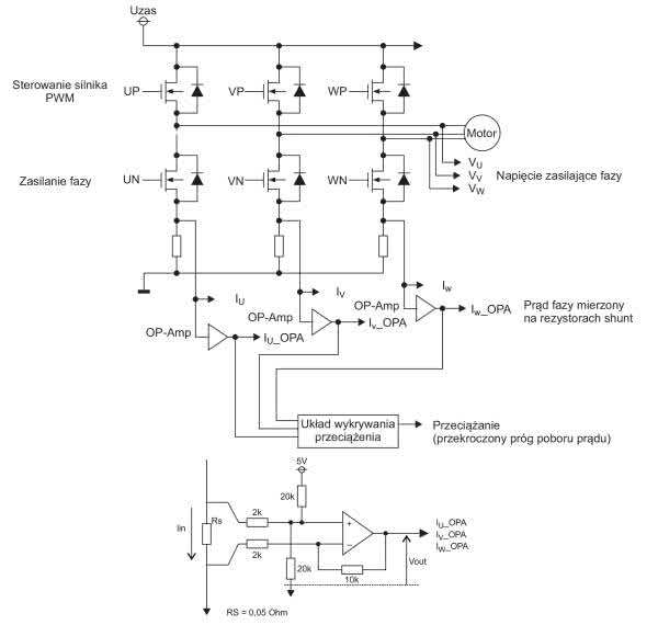 Na rysunku 21 pokazano przykładowy układ pomiaru prądu i sygnalizacji jego przekroczenia w trzech fazach (materiały firmy Renesas). Spadek napięcia na rezystorze Rs, proporcjonalny do płynącego prądu w obwodzie zasilania fazy, jest wzmacniany przez wzmacniacz operacyjny i poddawany konwersji przez przetworniki analogowo-cyfrowe.