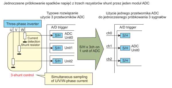 Pomiar poboru prądu w każdej z faz osobno jest potrzebny w układach sterowania wektorowego. Spotykane jest też uproszczone rozwiązanie z jednym wspólnym rezystorem Rs dla wszystkich faz. Potrójny układ pomiarowy pokazany na rysunku 21 wymaga trzech torów wzmacniaczy i trzech przetworników ADC. W przypadku, kiedy do pomiaru napięć BEMF w układach bezczujnikowych wykorzystujemy przetwornik ADC zamiast komparatorów, również musimy użyć 3 modułów ADC. Dostępne są rozwiązania, które pozwalają użyć do jednoczesnego pomiaru napięcia w trzech fazach jednego przetwornika ADC (rysunek 22).