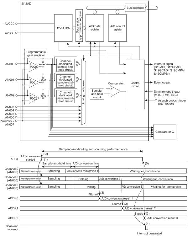 W mikrokontrolerach rodziny RX66T firmy Renesas moduł przetwornika ma na trzech liniach wejściowych zabudowane wzmacniacze o programowanym wzmocnieniu PGA. Napięcia z wyjścia PGA są również podawane na wejścia komparatorów. W torze tych linii wejściowych są umieszczone wyzwalane układy Sample and Hold. Próbki napięcia zapamiętane w układach Sample and Hold są po zakończeniu czasu próbkowania Thold kolejno konwertowane na postać cyfrową przez jeden moduł konwertera ADC (rysunek 23).
