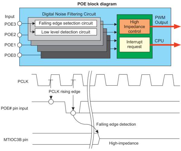 Przekroczenie dopuszczalnego prądu powoduje reakcję układu generującego przebieg PWM. Zmniejszana jest długość cyklu pracy (duty cycle) lub wyjścia PWM przechodzą w stan wysokiej impedancji. Wiele modułów PWM ma sprzętowe wejście sygnalizacji awarii. Wymuszenie na nim stanu aktywnego powoduje przejście w stan wysokiej impedancji wszystkich wyjść modułu PWM. Układy RX66T mają wbudowany specjalny moduł POE blokujący sygnały PWM z modułu MTU3d (rysunek 25).