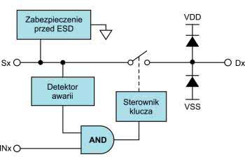 Na rysunku 10 pokazano przykładowy układ ochrony przeciwprzepięciowej (ADG5412F firmy Analog Devices) wykorzystujący półprzewodnikowy klucz do ochrony układu. Wbudowane diody, dołączone do linii zasilania, odcinają przepięcia od napięć zasilania. W momencie wystąpienie krótkiego impulsu wyższego napięcia, energia odprowadzana jest do masy poprzez układ zabezpieczenia ESD. Z kolei w momencie wystąpienia długotrwałego przepięcia, które w normalnych warunkach mogłoby przegrzać diody czy transile zabezpieczające, klucz rozłącza wejście, chroniąc układ przed uszkodzeniem.