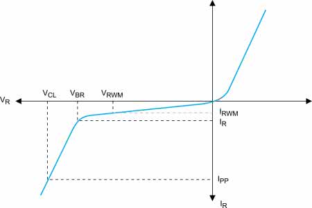 - maksymalne napięcie odcięcia VCL (Clamping voltage) – maksymalne napięcie na elemencie podczas przewodzenia określonego prądu maksymalnego (IPP). Napięcia te mogą być podawane dla różnych warunków (przewodzonego prądu, czasu trwania napięcia),