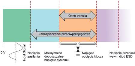 Na rysunku 9 pokazano regiony działania różnych zabezpieczeń dla zewnętrznego wejścia systemu analogowego. Obszar najbardziej po lewej stronie (w kolorze zielonym) reprezentuje normalne działanie, w którym napięcie wejściowe znajduje się między napięciami zasilania obwodów wewnętrznych. Drugi od lewej obszar (w kolorze niebieskim) reprezentuje zakres dopuszczalnych długotrwałych przepięć (prądu stałego i przemiennego), które będą się pojawiać na wejściu. Po prawej stronie (w kolorze fioletowym) znajduje się również napięcie wyzwalające dla wewnętrznych diod zabezpieczających ESD zabezpieczenia przeciwprzepięciowego. Napięcie przebicia TVS (w kolorze pomarańczowym) musi być dobrane tak, aby było mniejsze niż maksymalne napięcie odcięcia układów zabezpieczenia nadnapięciowego, znajdujące się w scalonym kluczu, odcinającym sygnał w momencie przepięcia.