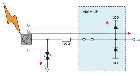 Ponieważ system analogowy zwykle wymaga, aby tylko styki przełącznika zabezpieczającego, znajdujące się po „wewnętrznej” stronie układu, były wyposażone w dodatkowe zabezpieczenia przeciwko ESD, to tam znaleźć można diody zabezpieczające. Elementy te służą jedynie jako dodatkowe urządzenie ochronne, które zadziała tylko w przypadku krótkich stanów przejściowych z szybkim czasem narastania, takich jak wydarzenia ESD czy EFT. Podczas dłuższych przepięć z powolnym czasem narastania impulsu napięcie na wyjściu przełącznika jest odcięte na poziomie definiowanym przez diody zabezpieczające do momentu, w którym zadziała wykrywacz awarii w przełączniku – w chwili, gdy aktywowane zostanie to zabezpieczenie przeciwprzepięciowe, klucz otworzy się, aby w pełni odizolować usterkę od zespołu obwodów wewnętrznych.