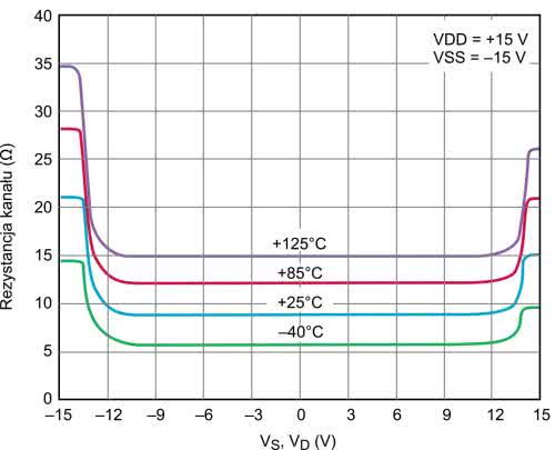 W przypadku systemów z niską impedancją wejściową istotny jest fakt, że zastosowany w układzie tranzystor charakteryzuje się małym oporem kanału. Co więcej, rezystancja ta jest stała w szerokim zakresie napięć wejściowych i tylko nieznacznie, ale w znany sposób, zmienia się z temperaturą. Obrazuje to wykres rezystancji klucza w funkcji napięcia, pokazany na rysunku 11. Dzięki płaskiej charakterystyce oporu nie wprowadza on nieliniowości do czułego toru analogowego.