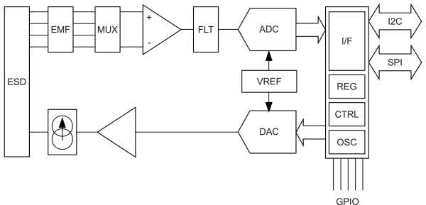 3. Kontroler – typowo wszystkie układy AFE posiadają rozbudowany kontroler cyfrowy (CTRL), zapewniający zarówno taktowanie wszystkich synchronicznych bloków układu (OSC), jak i zestaw rejestrów (REG) konfiguracyjnych oraz wyjściowych (czasem też pamięć FIFO), a także interfejs szeregowy (I/F – zwykle SPI lub I2C).