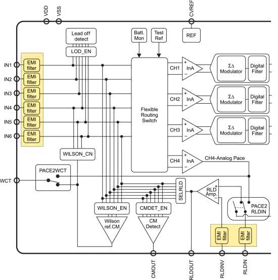 Na rysunku 3 został pokazany fragment schematu blokowego front-endu ADS1293, przeznaczonego do zastosowania w niewielkich elektrokardiografach. Jak widać, wszystkie wejścia współpracujące z elektrodami pacjenta zostały wyposażone we wbudowane filtry RFI, odcinające wysokoczęstotliwościowe zakłócenia w paśmie radiowym.