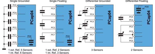 Innym ciekawym zastosowaniem multipleksera jest zwiększenie liczby możliwych konfiguracji stopnia wejściowego front-endu, co umożliwia współpracę z różnego rodzaju czujnikami – przykładem może być układ PCap04 firmy AMS, posiadający sześć wyprowadzeń wejściowych, umożliwiających podłączenie od 1 do 6 czujników oraz (w zależności od konfiguracji) także dodatkowych pojemności odniesienia (rysunek 4). Warto też dodać, że multipleksery dostarczają prostą i niezawodną metodę autokalibracji bez potrzeby użycia jakichkolwiek dodatkowych elementów zewnętrznych (tj. wyłącznie w obrębie struktury front-endu).