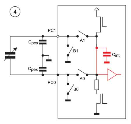 Przykład, znów zaczerpnięty z noty katalogowej PCap04, zaprezentowano na rysunku 5. Rozwarcie kluczy (tranzystorów polowych) łączących wejścia układu z przetwornikiem CDC (Capactivie-to-Digital Converter) umożliwia pomiar wewnętrznej pojemności kalibracyjnej CINT.