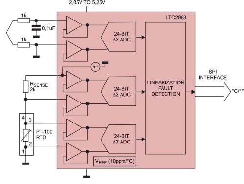• Bufory (wtórniki napięcia) – stosowane w większości front-endów, zarówno na wejściach pomiarowych, jak i w roli buforów dla przetworników DAC oraz wewnętrznych lub zewnętrznych źródeł napięcia odniesienia. W układach bazujących na przetwornikach ADC o wysokiej rozdzielczości (zwykle 24 bity, choć czasem można spotkać układy o jeszcze lepszych osiągach) wtórniki napięcia mogą bezpośrednio łączyć wejścia przetworników różnicowych z wyprowadzeniami front-endu Przykładem może być układ LTC2983 (rysunek 6).