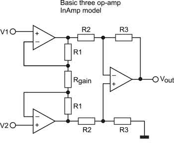 • Wzmacniacze pomiarowe (INAMP – instrumentation amplifier) – cechują się dość wysoką impedancją wejściową, dużą wartością współczynnika CMRR (szczególnie w zakresie do drugiej harmonicznej częstotliwości sieciowej, czyli do ok. 100 Hz) oraz stałym lub regulowanym programowo wzmocnieniem, jak również stosunkowo niewielkim pasmem przenoszenia (zwykle na poziomie kiloherców). Klasyczna konfiguracja wzmacniacza typu INAMP została pokazana na rysunku 7.