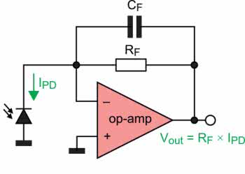 • Wzmacniacze transimpedancyjne (TIA – transimpedance amplifier) – konwertują niewielkie prądy wejściowe na napięcie, podawane następnie na przetwornik ADC. Wzmacniacze tego typu są stosowane najczęściej w układach AFE współpracujących z fotodiodami lub (bio)sensorami elektrochemicznymi. Podstawowy schemat wzmacniacza transimpedancyjnego zastosowanego do pomiaru prądu fotodiody pokazano na rysunku 8. Wzmocnienie układu ustala wartość rezystora RF w pętli sprzężenia zwrotnego, a równoległy do niego kondensator CF o niewielkiej wartości zapewnia niezbędną stabilność układu.