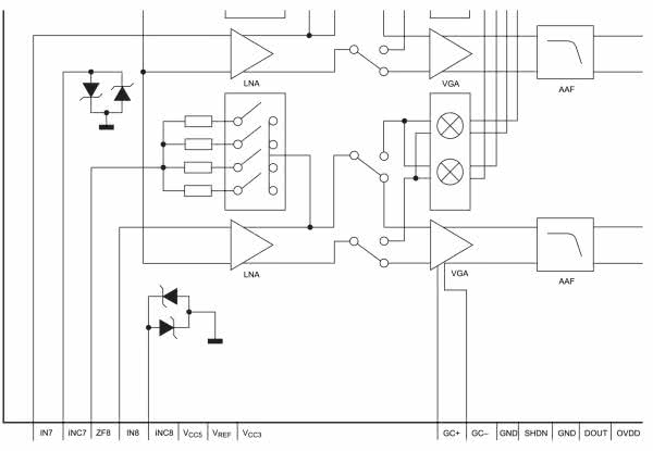• Wzmacniacze o zmiennym wzmocnieniu (VGA – variable-gain amplifier) – stosowane są głównie układach pracujących z wyższymi częstotliwościami (zwykle od kilku megaherców do pasma mikrofalowego włącznie). Wzmocnienie może być ustawiane w różny sposób, jak choćby z użyciem przeznaczonych do tego celu wyprowadzeń układu. Przykład takiego rozwiązania, pochodzący ze schematu blokowego front-endu ultradźwiękowego MAX2079, został pokazany na rysunku 9.