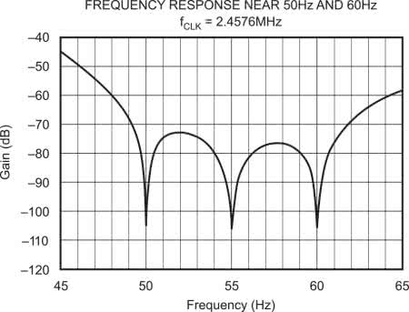 W niektórych przetwornikach wyboru tłumionej częstotliwości dokonuje sam użytkownik (np. poprzez zmianę szybkości taktowania modulatora), w innych charakterystyka jest fabrycznie dostosowana do tłumienia zarówno 50 Hz, jak i 60 Hz. Przykład takiego układu stanowi przetwornik ADS1244, którego fragment charakterystyki w rejonie częstotliwości sieciowych pokazano na rysunku 10.
