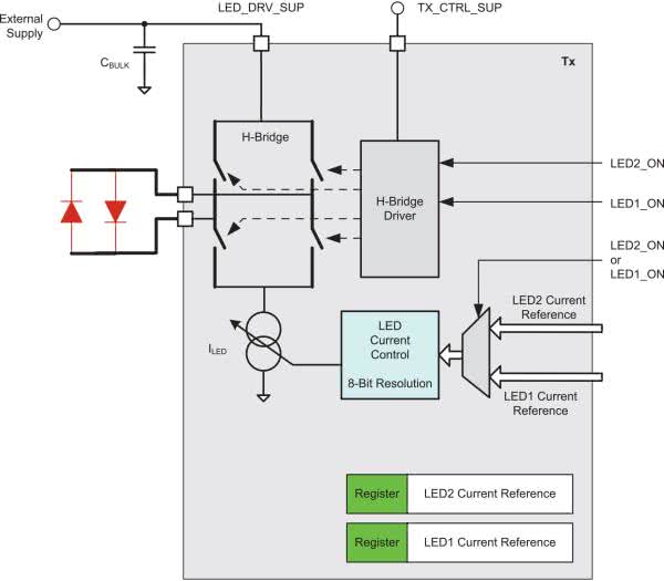 Dobrym przykładem stosunkowo złożonego toru wyjściowego jest sterownik diod LED w układzie AFE4490 firmy Analog Devices, przeznaczony do budowy pulsoksymetrów klinicznych (rysunek 11). Diody LED, służące do oświetlania (lub prześwietlania) tkanki pacjenta są podłączone do mostka H, sterowanego przez zintegrowany kontroler i zasilanego przez regulowane cyfrowo źródło prądowe. Do zadawania określonej nastawy źródła służy 8-bitowy przetwornik DAC oraz układ zarządzania wartościami natężenia prądu dla poszczególnych diod. Użycie mostka H jest konieczne z uwagi na powszechnie stosowane, przeciwsobne połączenia diod LED w standardowych czujnikach SpO2 – więcej informacji na ten temat przedstawimy w artykule poświęconym front-endom przeznaczonym do aplikacji pulsoksymetrycznych.